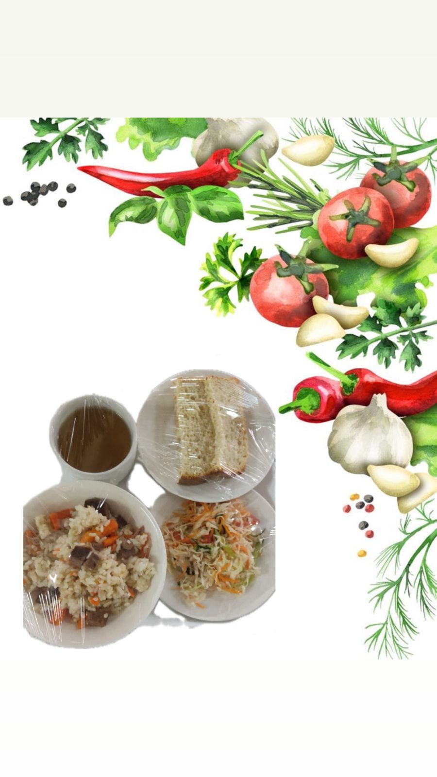 » » » Ақ нан, күріш етімен, көкөніс салаты, компот